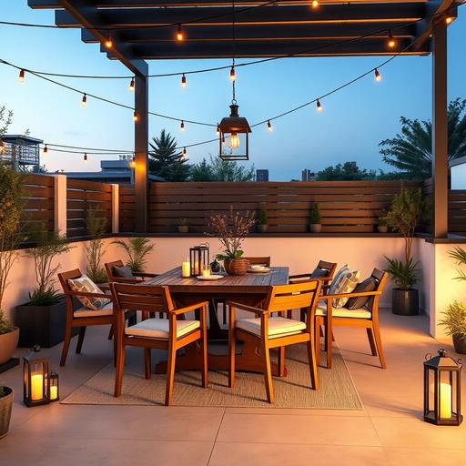 Атмосфера создаётся текстилем, освещением и растениями. Подушки и скатерти добавляют цвета и уюта, но выбирайте ткани, рассчитанные на уличные условия: быстро сохнут и не выгорают. Освещение влияет на настроение: гирлянды придают лёгкую праздничность, фонари создают локальное тепло, свечи добавляют интимности. Располагайте источники света так, чтобы они не слепили гостей и освещали рабочие поверхности.